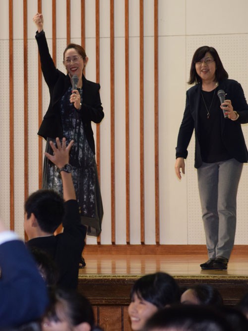 [写真/松田会長のアドバイスも受けながら演奏した生徒たち ]
