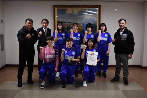 第18回全日本女子フットサル大会(3月4~6日、帯広市)に出場する釧路リベラルティが11日、市役所を訪れ、蝦名大也市長に活躍を誓った。