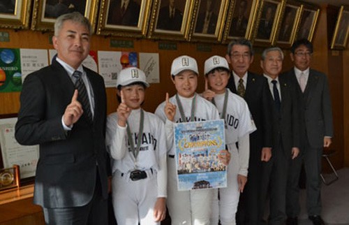 第12回西日本選抜女子学童野球岡山大会(昨年12月25、26日、岡山県)で道代表の「北海道スノーホワイト」が優勝し、釧路市内から代表に選出された石川芽依さん(釧路市立阿寒湖義務教育学校6年)と橋本美織さん(同鶴野小6年)、門馬有晏さん(同美原小6年)が11日、釧路市役所を訪れ、蝦名大也市長に優勝を報告した。