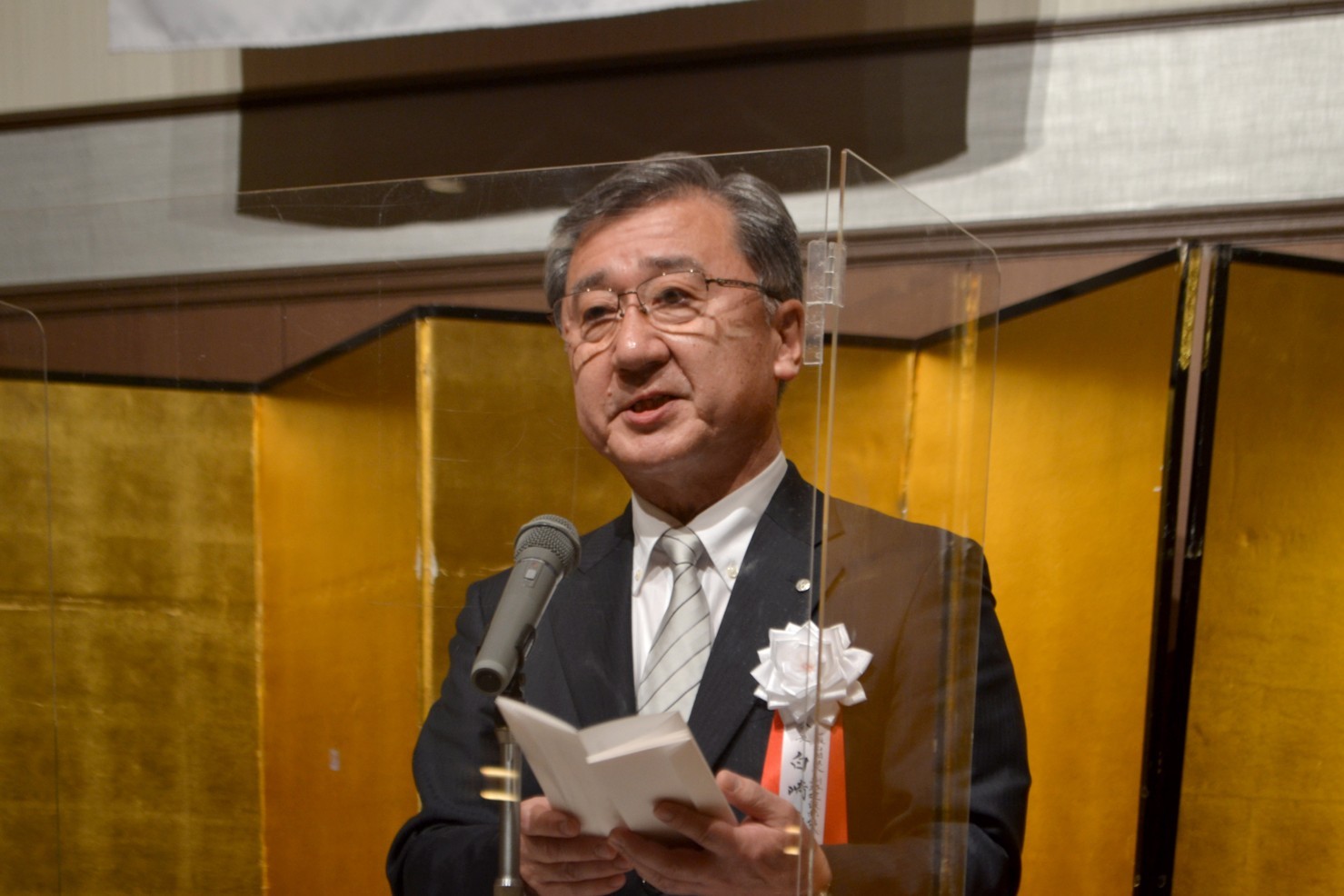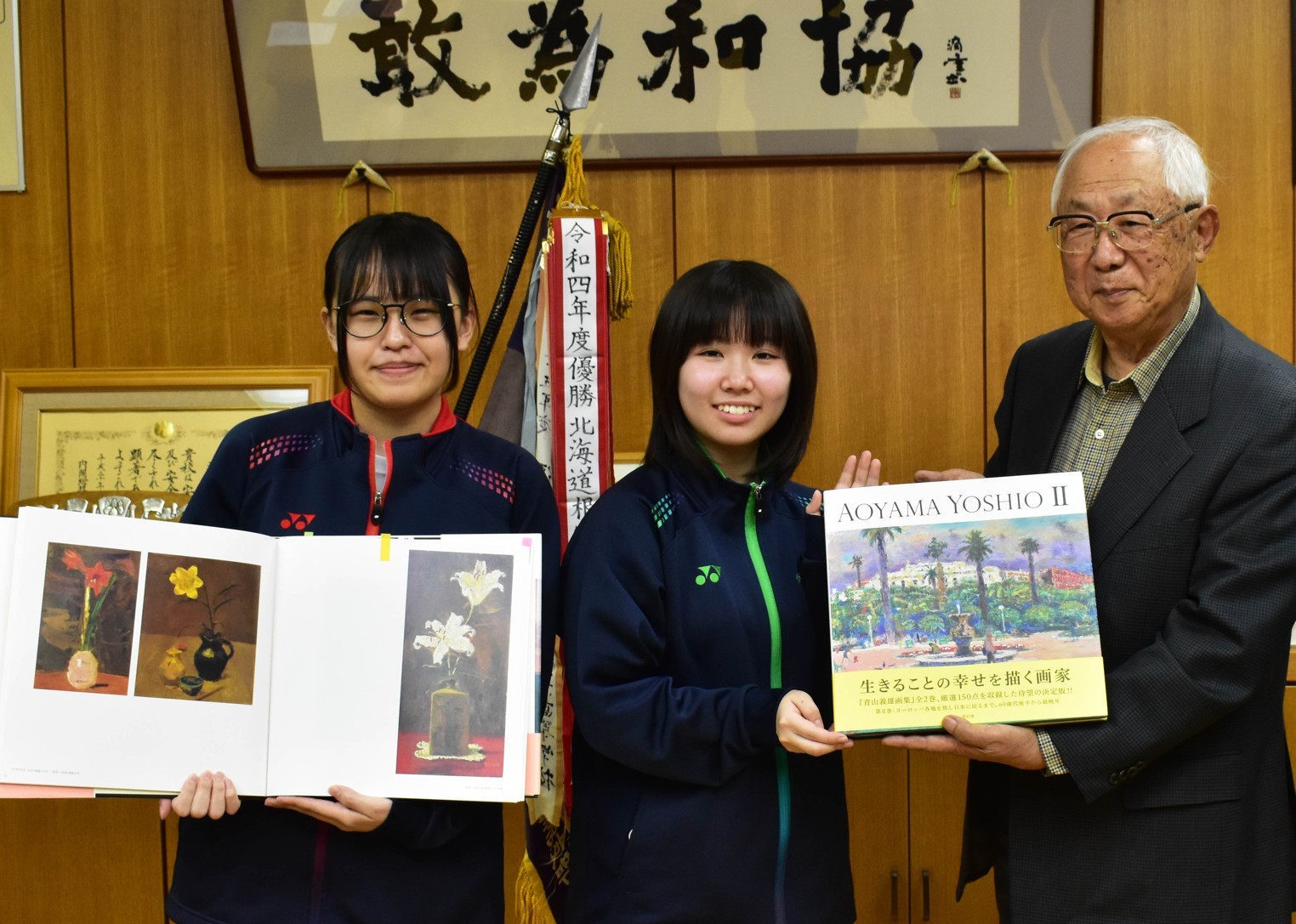 [写真/石垣市長(右)に反射板を託す荒木会長(左)ら ]