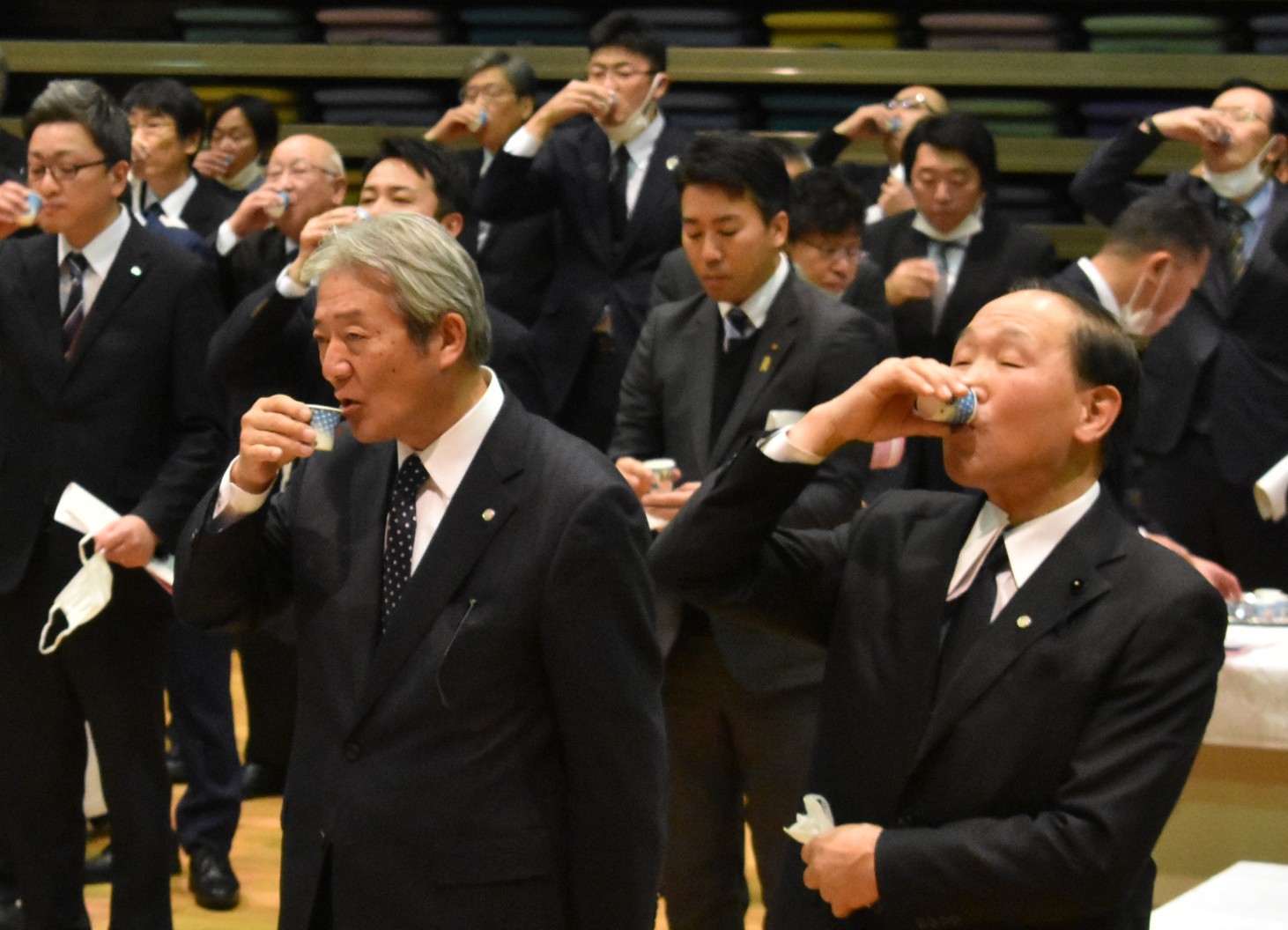 [写真/新年交礼会であいさつする山田会長 ]