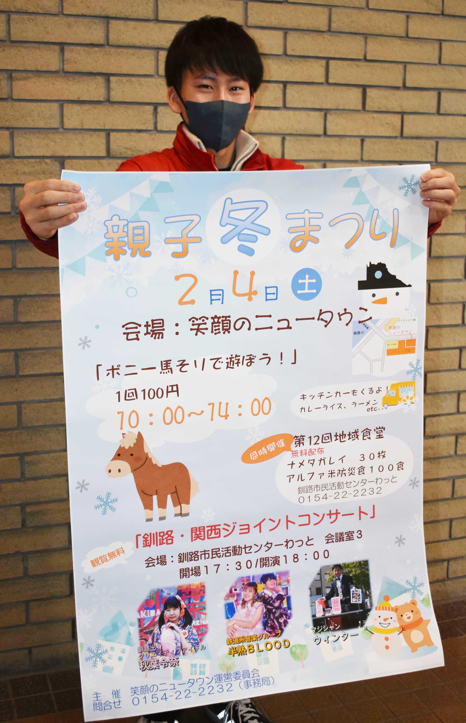 同運営委員会の小林友幸委員長は「親子で楽しめるイベント。ぜひご来場いただきたい」と呼び掛けている。ポニーの馬そり体験は午後2時まで。駐車場は釧路センチュリーキャッスルホテルの第2駐車場が利用できる。問い合わせは、わっと0154(22)2232へ。