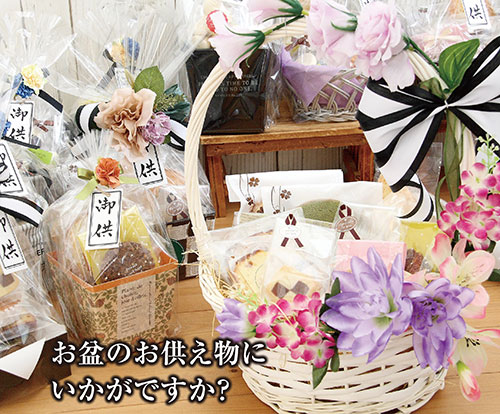 8月に入り、もうすぐお盆の時期です。お盆が近くなると、仏壇のお供え物を何にしようか迷ってしまう方も多いのではないでしょうか?シュシュアンジュでは、毎年お盆の時期に合わせたお供え用のお菓子を詰め合わせた特設コーナーを設けています。価格も1,000円台から6,000円くらいまで、ニーズに合わせバリエーションも豊富です。また、ラッピングの飾りも少しずつ違うので、自分の気に入った物を選べます。自分が楽しんで選んだ物をお供えするのもよい供養になるのではないでしょうか?その他にもお供え用のプリザーブドフラワーやドライフラワーなどもありますよ。今年のお盆はシュシュアンジュのお菓子をお供えしてみませんか?