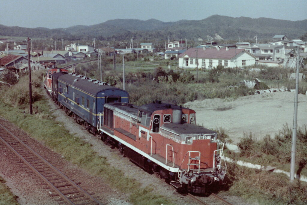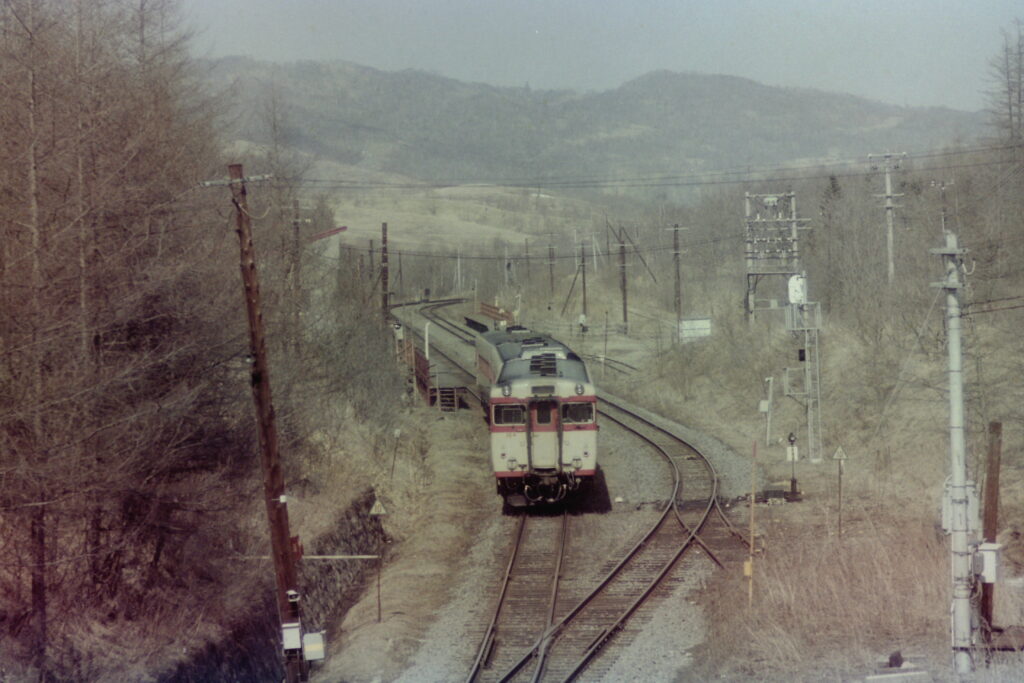 古瀬仮乗降場を通過するキハ27と56の急行(1986年7月)