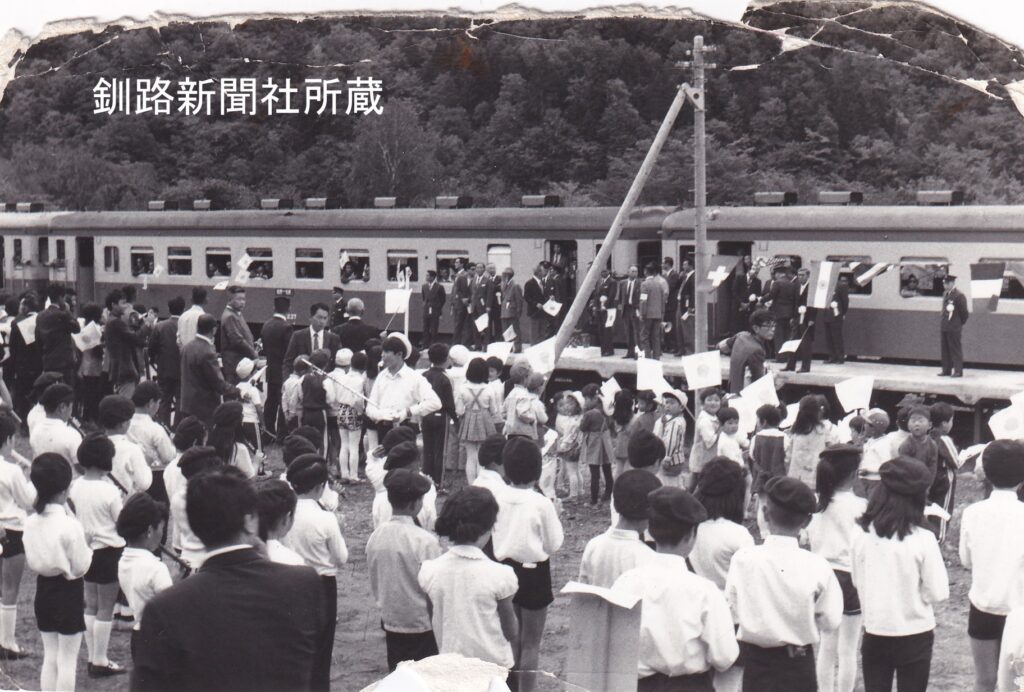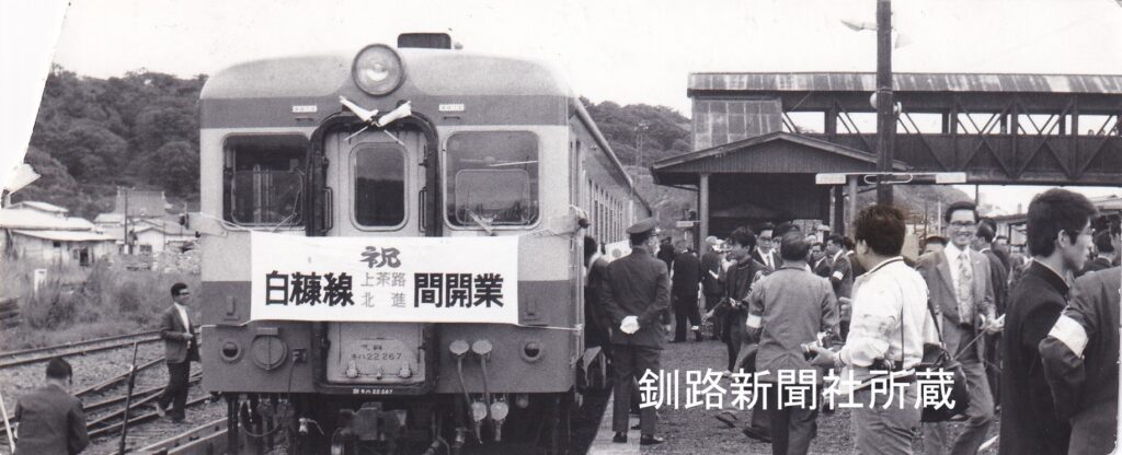 上茶路~北進の開業を祝う横断幕を付けた列車(1972年9月8日 白糠駅)