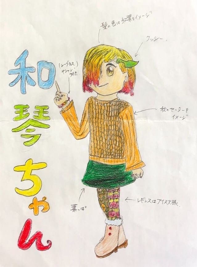 同製作委が和琴のキャラを構想していた21年、和琴小から「高学年の授業で考えてもらおう」と打診があった。当時の高学年児童3人が意見を出し合い、原案を描き上げた。いつてしの各キャラクターを手掛けるイラストレーター鈴原ミヤコさんが原案を元にリデザインし、完成した。