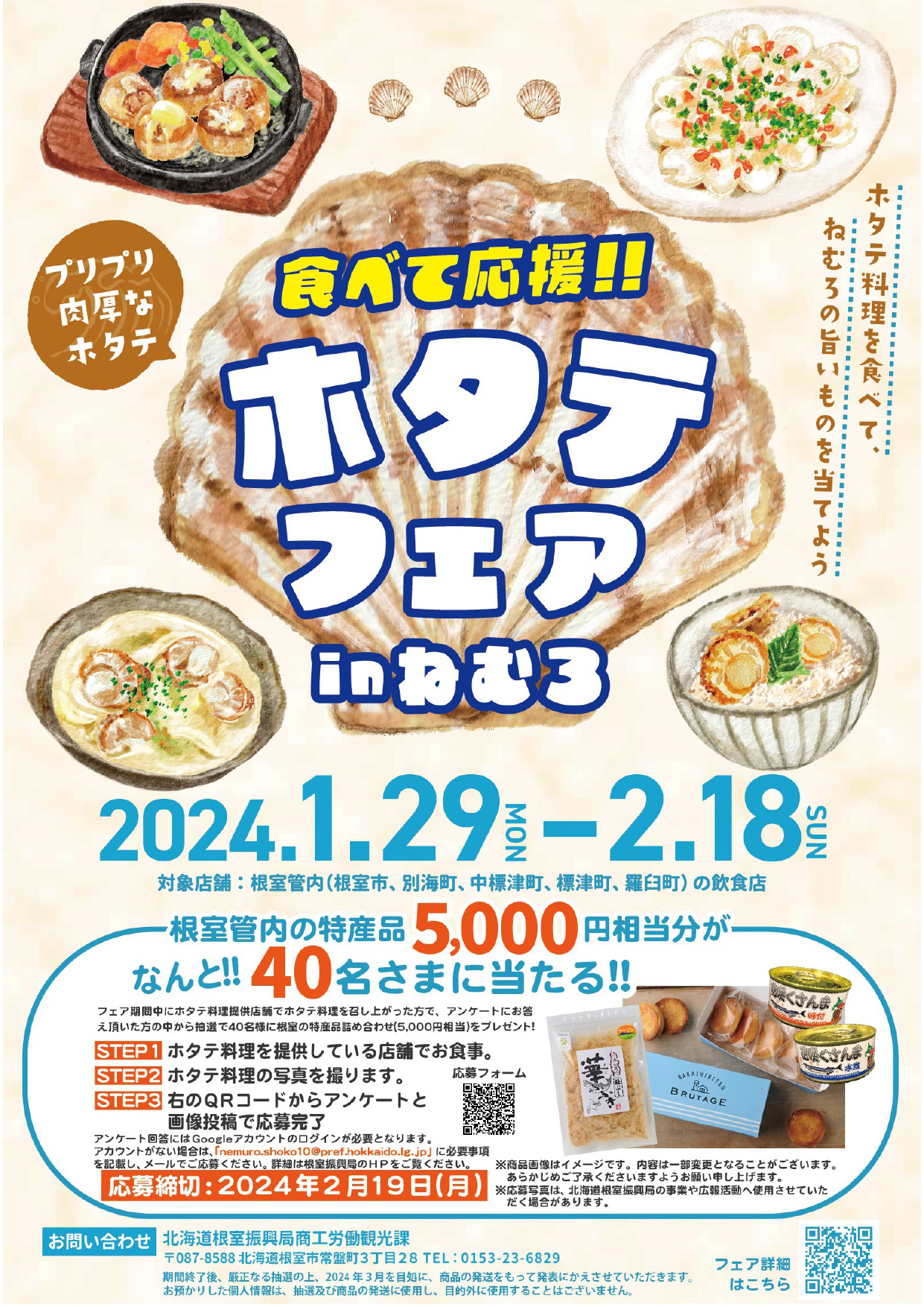 根室管内のホタテ料理を提供している飲食店で食事をし、その料理の写真を撮影、PRチラシに添付されている応募フォーム(QRコード)からアンケートと画像投稿で応募が完了する。料理は飲食店提供に限るので、ホタテの刺し身をスーパーで購入した場合は応募不可。1人で複数応募も可能だ。応募にはグーグルアカウントが必要だが、アカウントがない場合は根室振興局商工労働観光課へのメールで応募する。