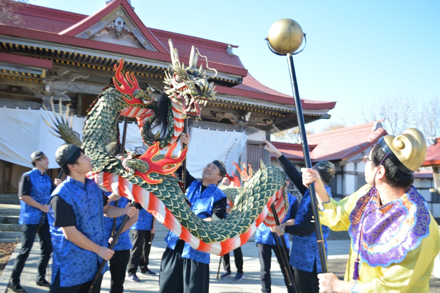 [写真/「諸願成就」を願い龍踊を披露するくしろ元町青年団のメンバーら]