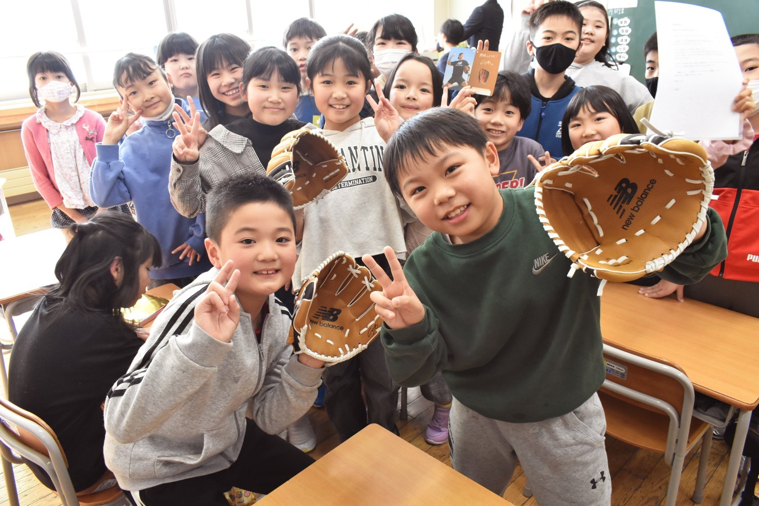 [写真/大谷選手から寄贈されたグローブを手にする児童たち(丸山小学校、17日)]