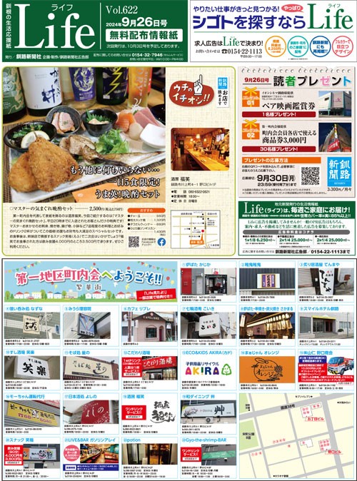 第一地区町内会を代表して表紙を飾るのは酒房福笑。今回ご紹介するのは「マスターの気まぐれ晩酌セット」。平日20時までに入店されたお客さんだけの特典です!マスターおまかせのお刺身、焼き物、揚げ物、小鉢など7品程度のお料理とお好みのドリンク2杯がついてこの価格!お腹もお財布も大満足のスペシャルセットです。お食事後は、姉妹店で隣接するスナック笑福(えふ)で二次会はいかがでしょう?福笑でお食事された方は飲み放題4,000円のところ3,500円で承ります。ぜひご利用ください。