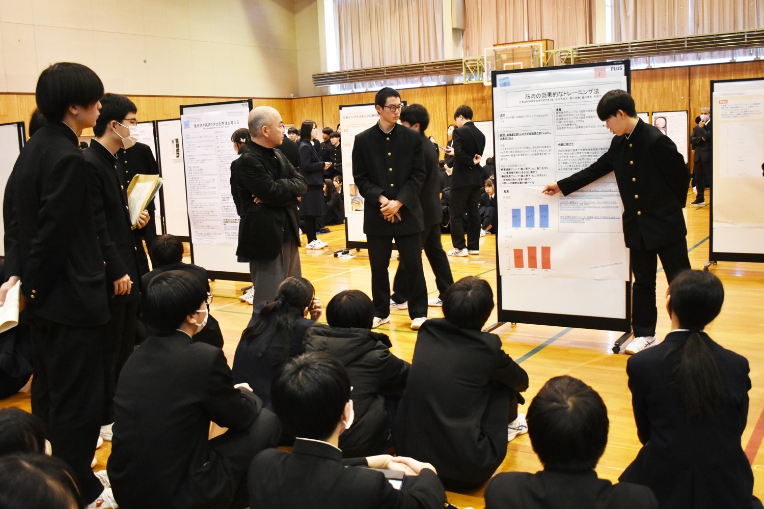 この日の発表会では、テーマ別に取り組んだ生徒たちが大きな模造紙に発表内容をポスター形式にまとめた資料を掲示し、7分間の持ち時間で説明。さらに3分間の質問タイムが設けられ、熱心な成果発表が行われた。