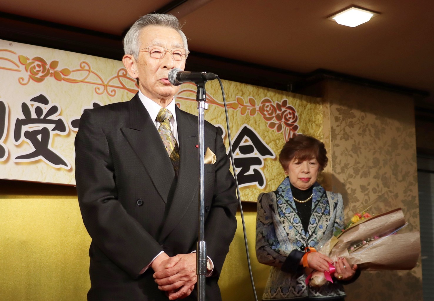[写真/謝辞を述べる山本氏と裕子夫人(成田友美通信員撮影)]