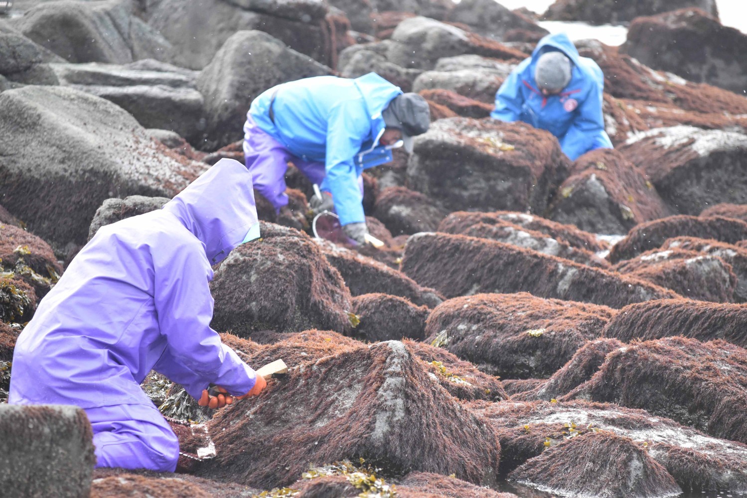 【根室】根室半島の厳寒期の風物詩となっている歯舞地区前浜でのフノリ漁が3日から始まり、防寒装備の漁業者らが岩場に着生したフノリを独特の漁具でむしり取る音が響き渡った。