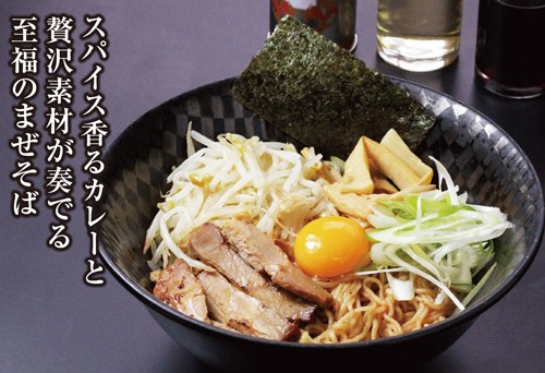自慢の麺に合わせるのは、独自に調合したカレースパイス。魚介を感じる濃厚な旨みと適度な辛みとスパイス感で食欲が進む。卵黄やチャーシューなどを絡めて豪快に味わって頂きたい一杯だ。