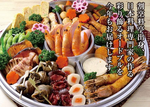 今年も海鮮を中心に、当日早朝からの「手づくり」にこだわり盛り付けを行うというオードブルの品は昨年大好評だった焼き物「自家製無添加の銀ダラの西京焼き」が今年も味わえるとのこと。その他、鮭の炙り焼き・旬の牡蠣フライ・海老フライ・鶏唐揚げ、そして伝統的縁起物のサーモン砧巻は繊細な包丁の技が必要で手間をかけた「福」をお届け。煮物も出汁を生かした味付けで女性や高齢者にも嬉しい味付けとなっていて、冷凍食品などとは違う手づくりのあたたかさを是非味わってほしいとの事です。