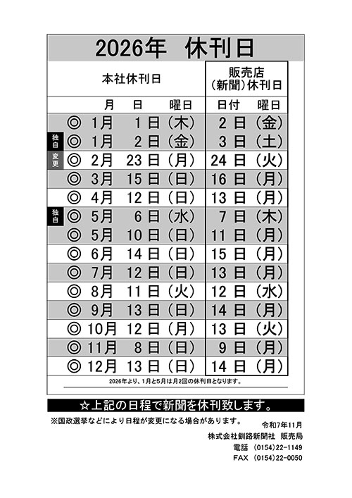 日ごろ釧路新聞をご愛読いただきありがとうございます。