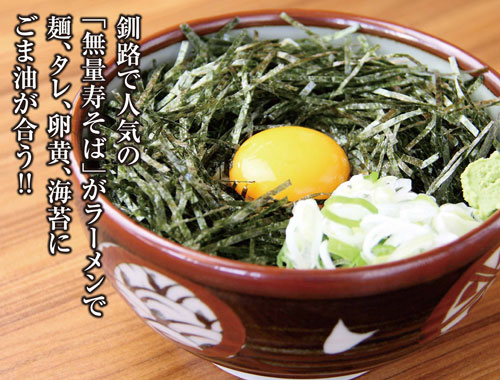 香り高い岩井の純正黒ごま油を贅沢に使用し、独自に調合した醤油ダレと卵黄などの具材を贅沢に加え、味わい深くもスルスルと箸が進む大満足の一杯に仕上げた。2021年、夏の限定メニューとして登場したが、大きな反響があり同年秋には通常メニューに昇格。人気のラーメンメニューが各種ある中でも不動の人気を誇る。今回ご紹介した「イオンモール釧路昭和店」のほか「春採本店」で味わえる。まだ食したことのない人は是非!
