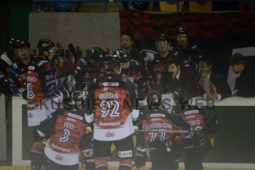 [写真/第3ピリオド終了10秒前のタイムアウトで攻撃の戦術を確認するクレインズベンチ ]