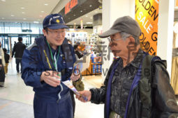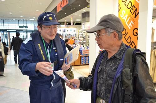 [写真/買い物客に海難事故防止を呼び掛ける釧路海上保安部の職員 ]