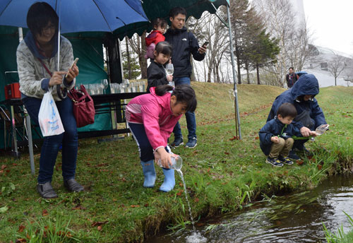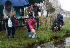 [写真/稚魚を放流する子供たち ]