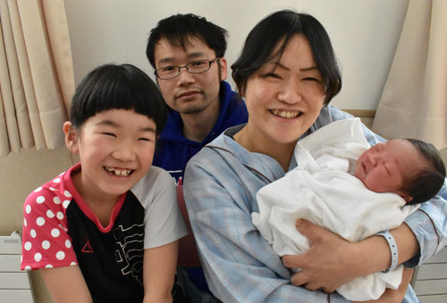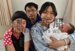 [写真/釧路市の令和ベビー第1号となった瑛士ちゃんを抱く母奈美子さん、父貴之さん、長女凉佳さん ]