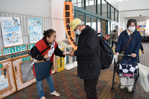 [写真/消費生活に役立つ情報をまとめた資料を手渡した街頭啓発 ]