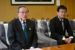 [写真/会見で「重み、責任を痛感している」などと述べた松永議長と松橋副議長(左から) ]