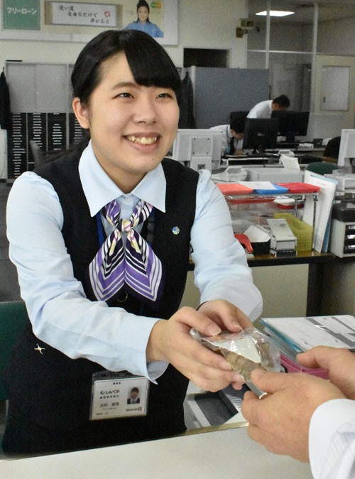 [写真/窓口で球根を手渡す職員 ]