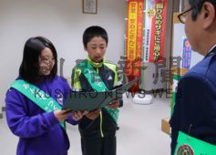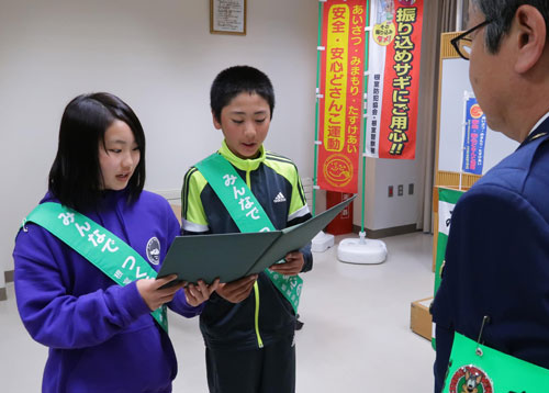 [写真/「ねむろ安全・安心まちづくり宣言」を行う長谷川君(右)と浅野さん ]