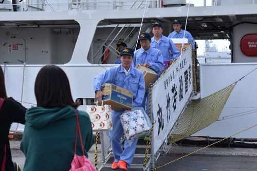 [写真/保護者らの出迎えを受け笑顔で下船する実習生 ]