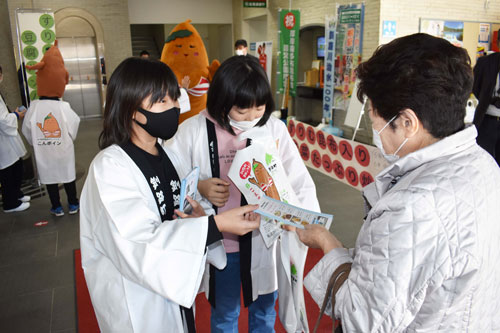 [写真/来庁者(右)にレシピを渡すなど地場産コンブをPRする児童たち ]