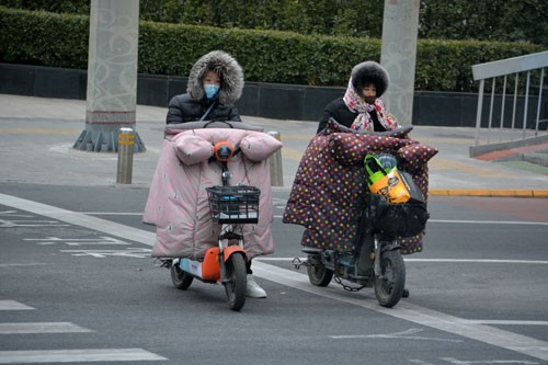 [写真/こたつを縦にしたような前掛けで完全防寒して電動バイクを運転 ]