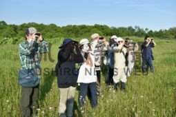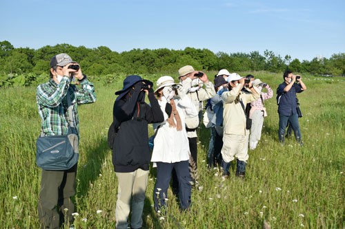 [写真/鳥を見つけ、一斉に双眼鏡を向ける参加者 ]