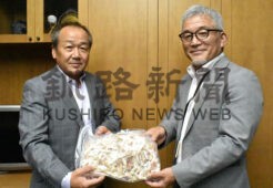 [写真/ホッキを手に刀称谷部会長(左)と登藤教育長 ]