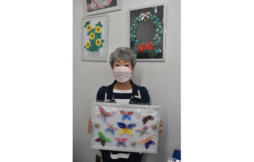 [写真/折り紙で製作したチョウの作品を手にする萩原さん ]