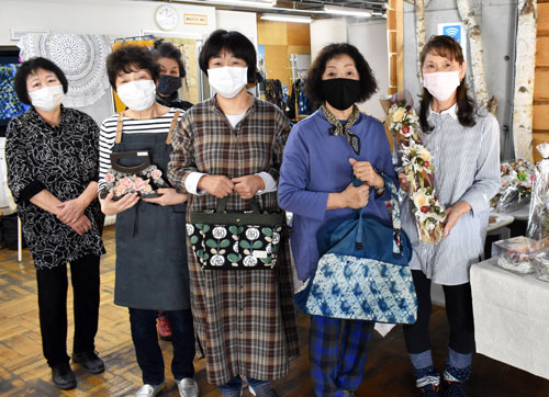 [写真/「手作り作品を見に来てください」とメンバーたち ]