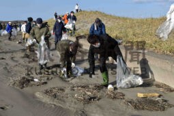 [写真/海岸に流れ着いたごみを拾い集める根室市民 ]