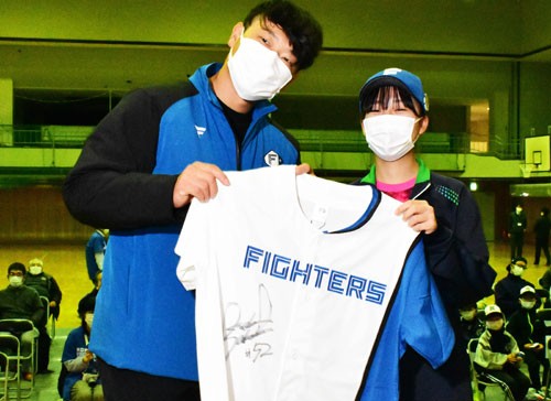 [写真/ユニホームが当たり、池田投手(左)と写真に収まる参加者 ]