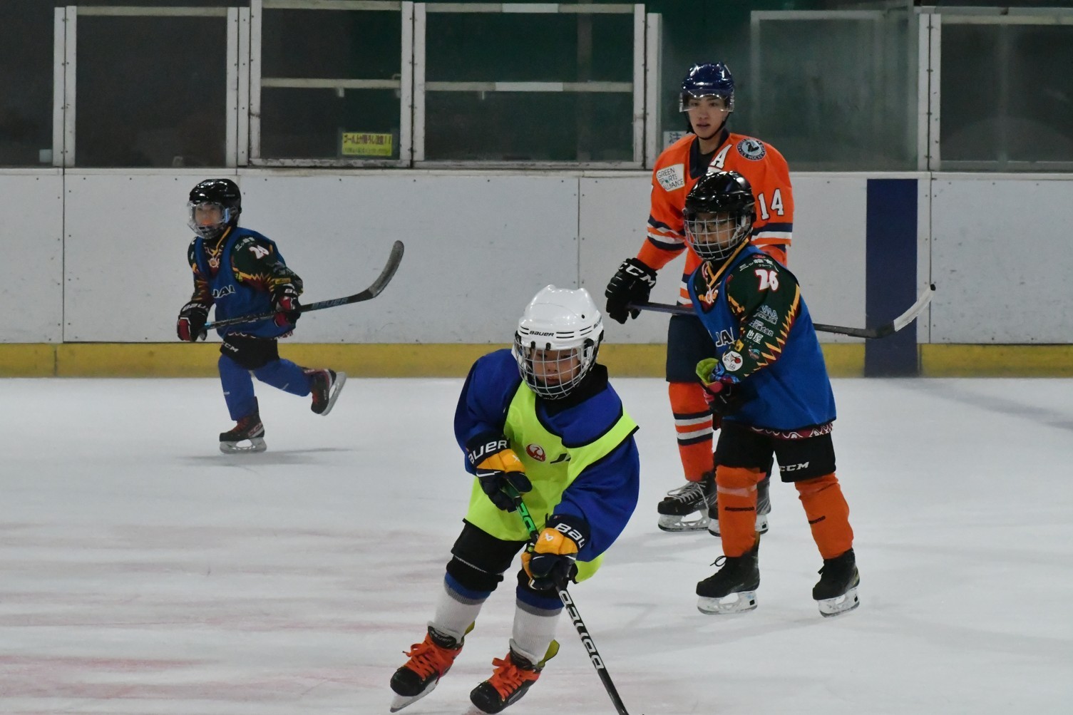 [写真/大学生選手を交えた練習試合に臨む小学生]