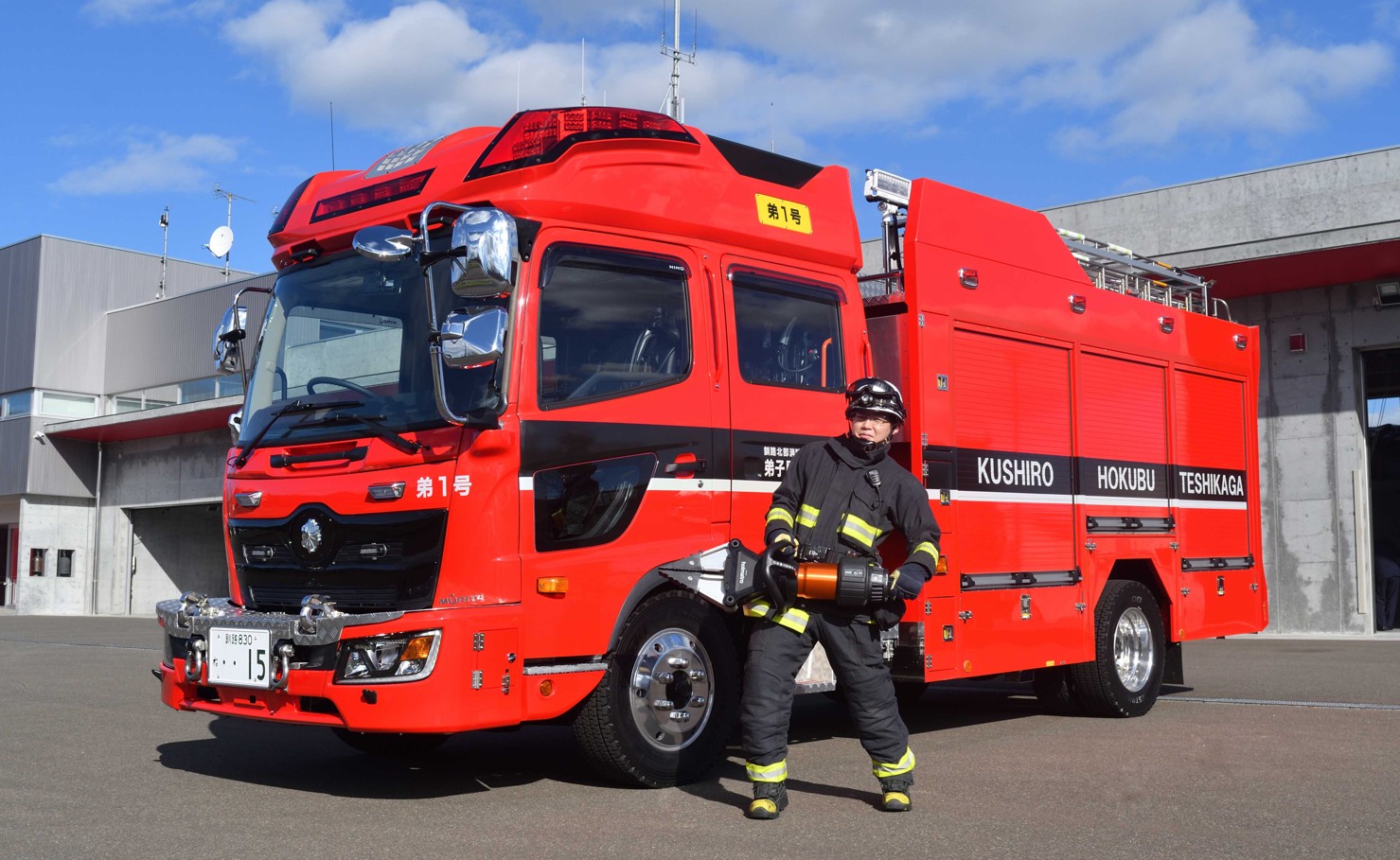 [写真/弟子屈1号と、電動油圧救助器具を手にした消防署員]