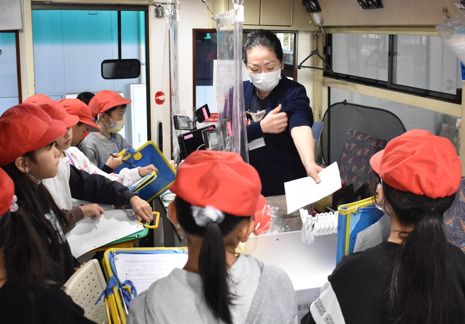 [写真/移動献血車で看護師から献血の方法を教わる児童]