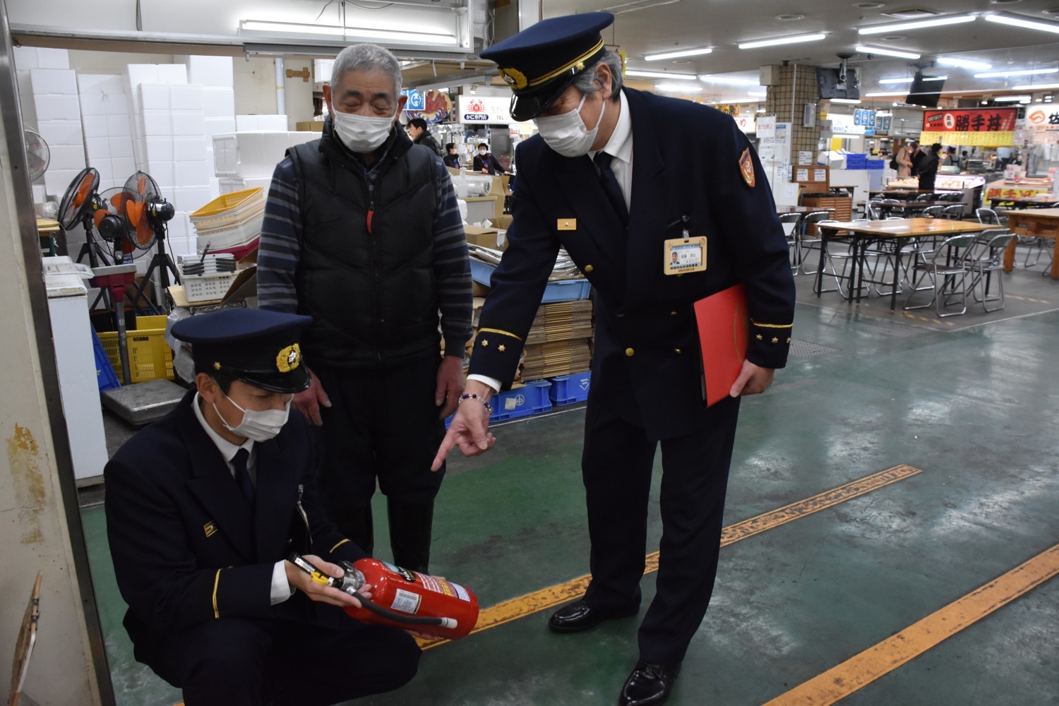 [写真/相原理事長(中央)の立ち合いで消火設備を点検する遠藤署長(右)]
