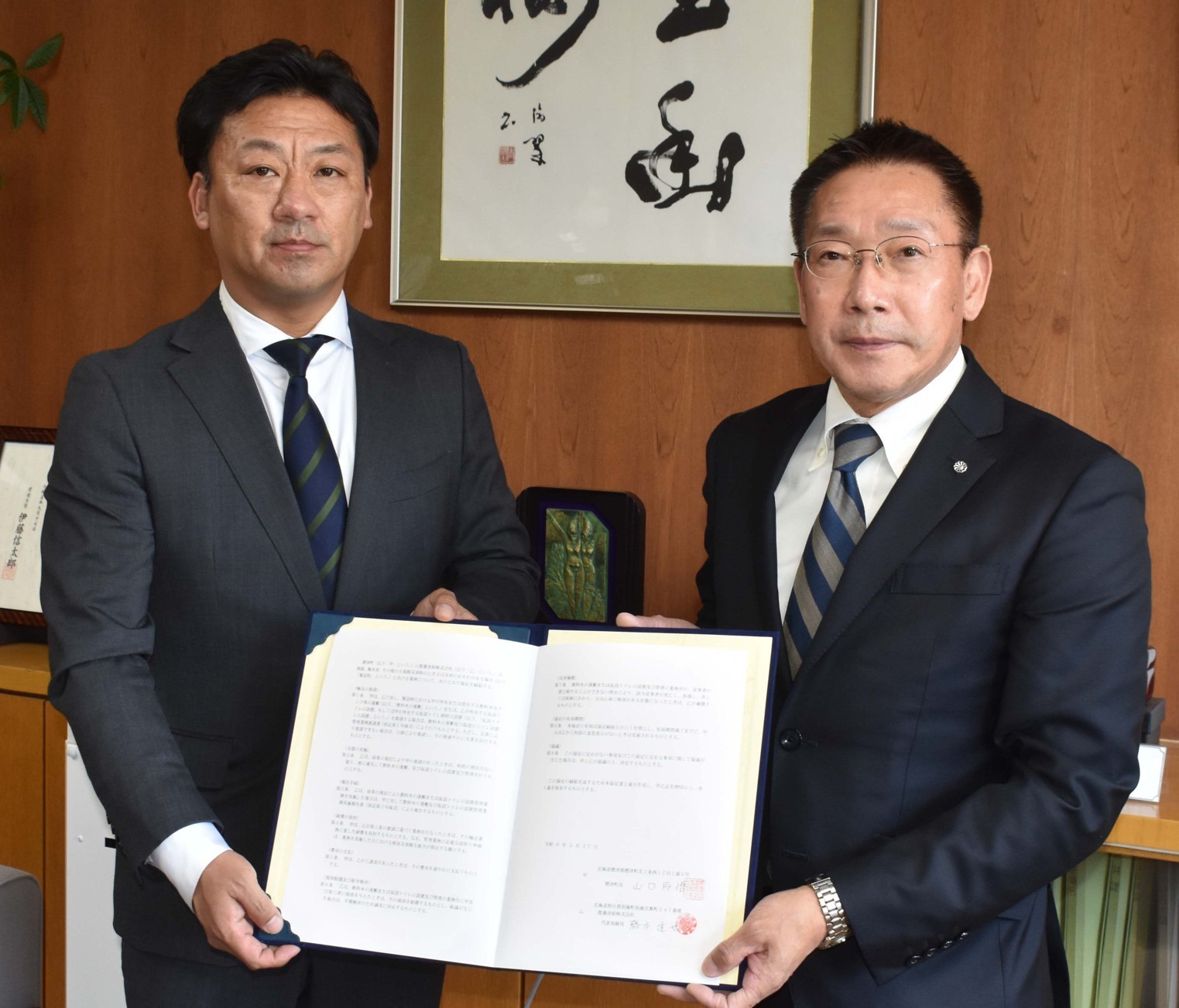 [写真/協定書を交わした山口町長(右)と藤本専務]