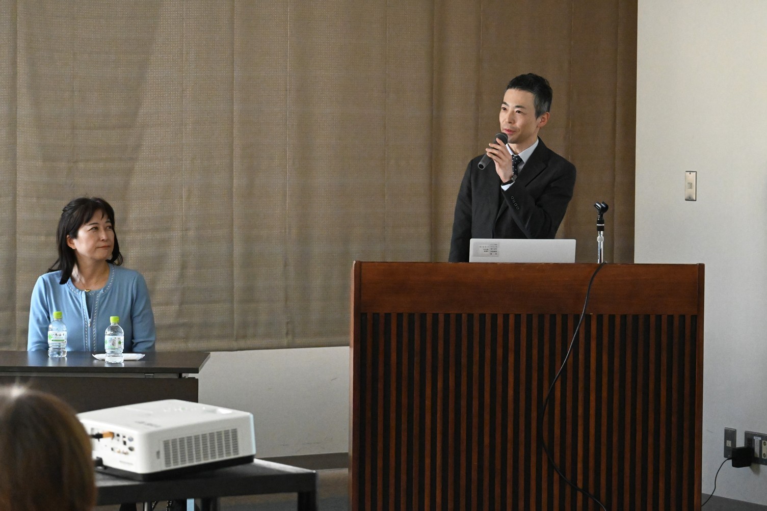 [写真/講演した高野氏(右)と新谷氏]