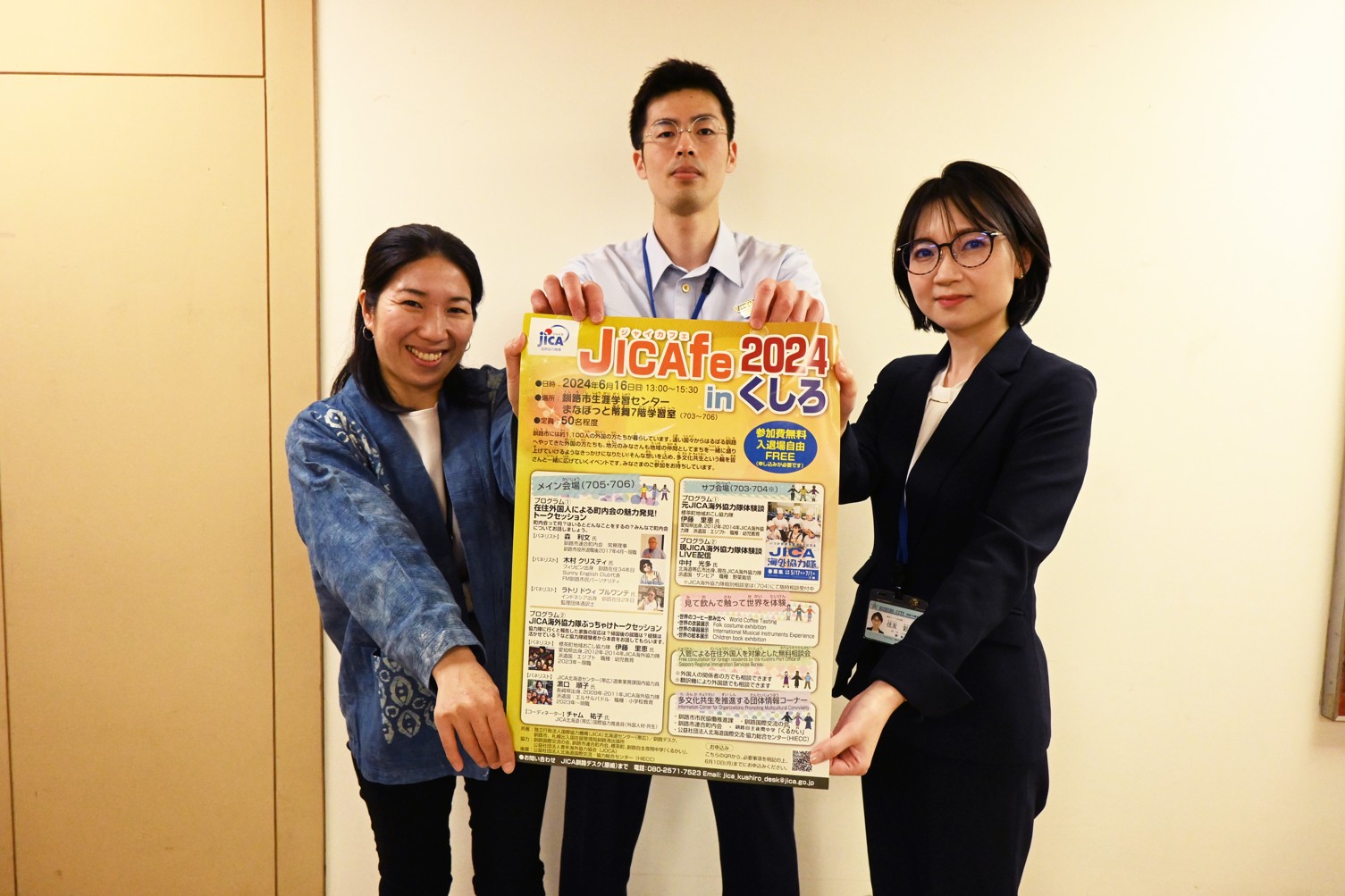 [写真/ポスターを手に来場を呼び掛ける釧路デスクの原嶋さん、釧路港出張所の古賀裕太朗さん、市職員の住友彩香さん(左から)]