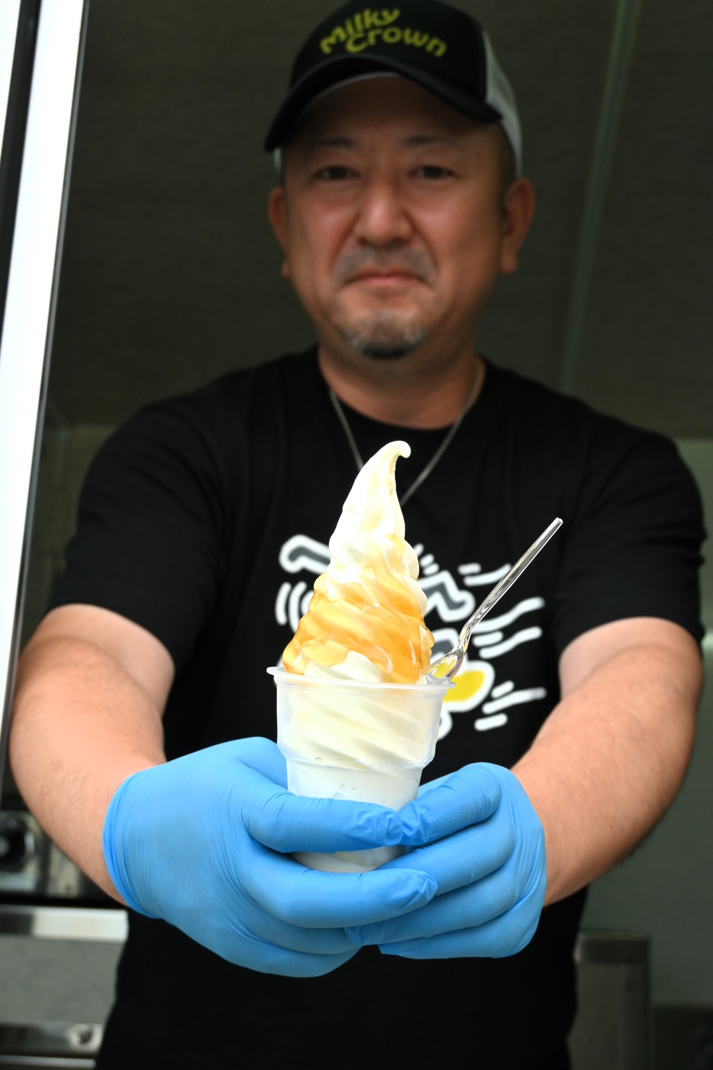 [写真/お薦めの蜂蜜をトッピングに、カップいっぱいに巻かれたソフトクリーム]