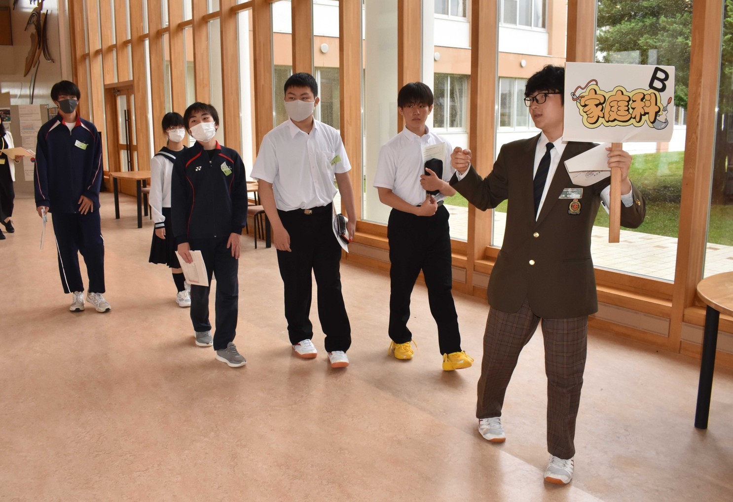 [写真/松舘生徒会長(右端)に校内を案内される参加した中学生]