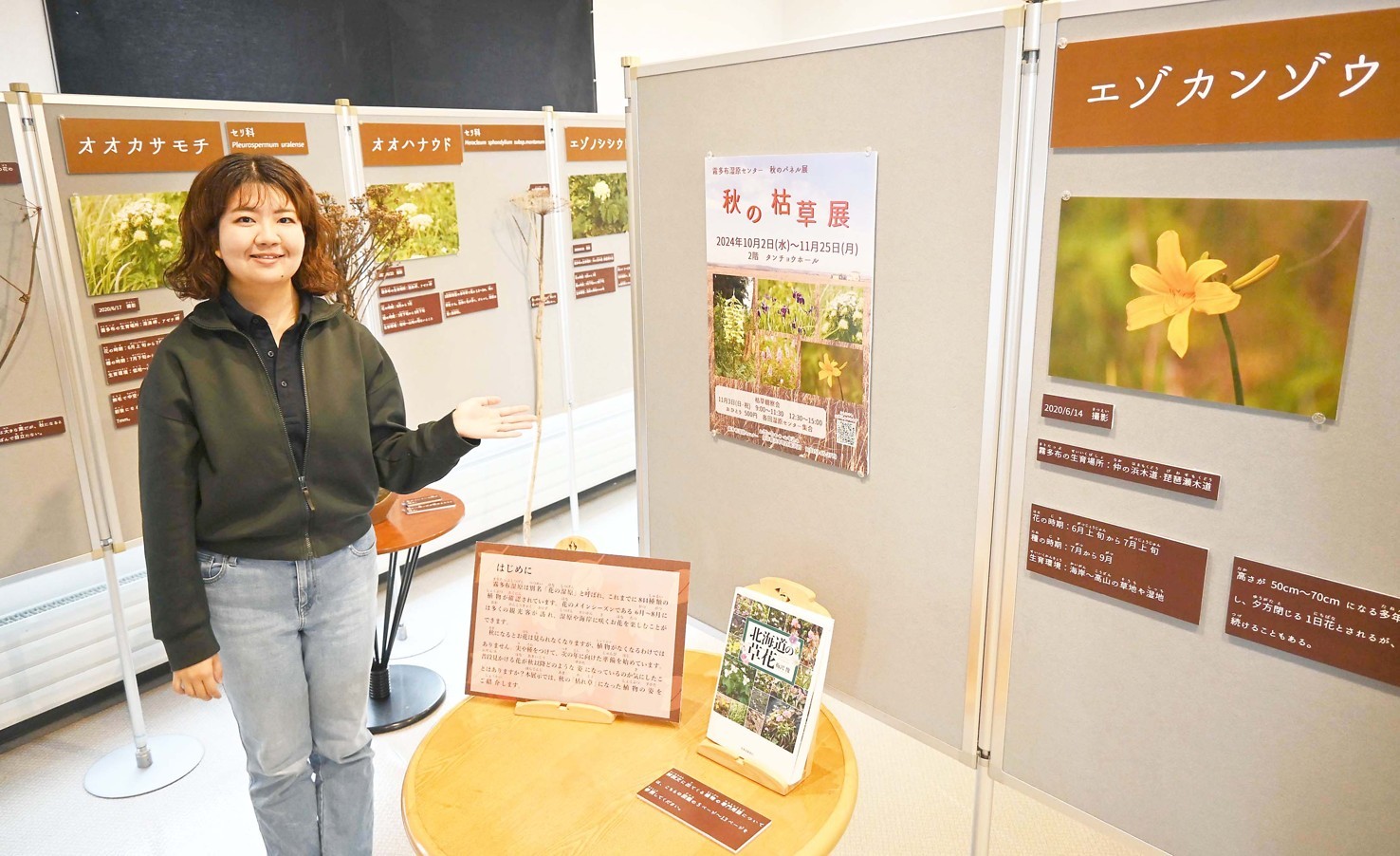 [写真/霧多布湿原センターで開かれている展示。3日の観察会の参加者も募集している]