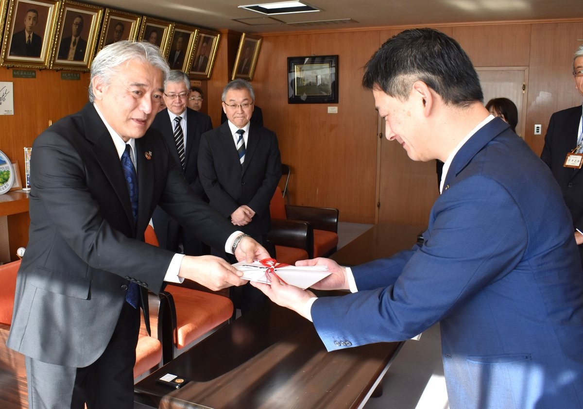 [写真/鶴間市長に目録を手渡す原田社長(左)]